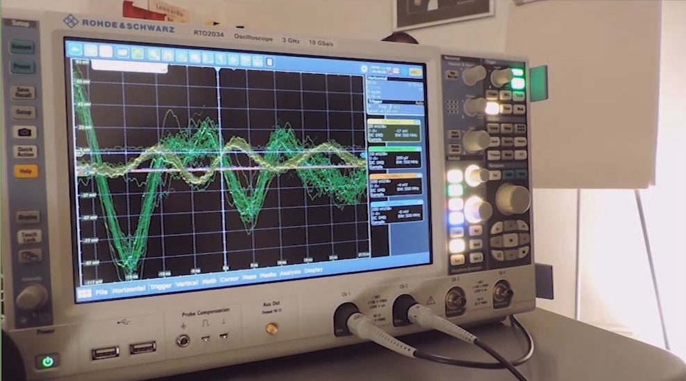 The oscilloscope has been connected to a couple of square antennas on 2 separate channels.